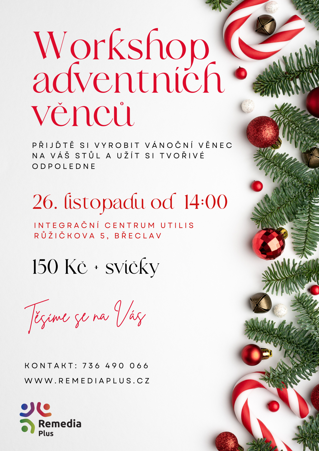 Pozvánka na Workshop adventních věnců Přijďte si vyrobit vlastní vánoční věnec na váš stůl a užít si příjemné tvořivé odpoledne. 26. listopadu od 14:00 Integrační centrum Utilis, Růžičkova 5, Břeclav Cena: 150 Kč + svíčky Těšíme se na Vás! Kontakt: 736 490 066